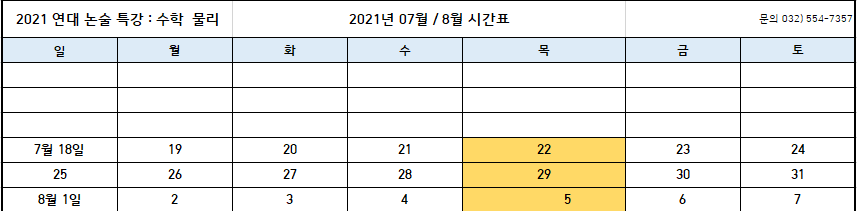 연대 논술 방학 특강은 수학 / 물리 선택 가능합니다. 개학이후 시간은 토요일로 배정될 계획이며 아직 미정입니다. 논술 시험의 특성에 맞추어 답안 작성 요령과 개인별 첨삭 지도를 추가하여 지도.